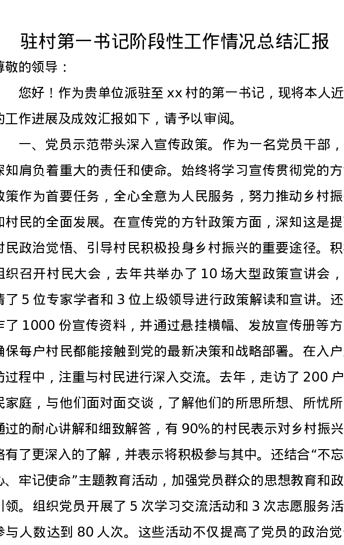 驻村第一书记阶段性工作情况总结汇报