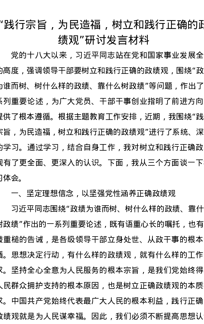 “践行宗旨,为民造福,树立和践行正确的政绩观”研讨发言材料