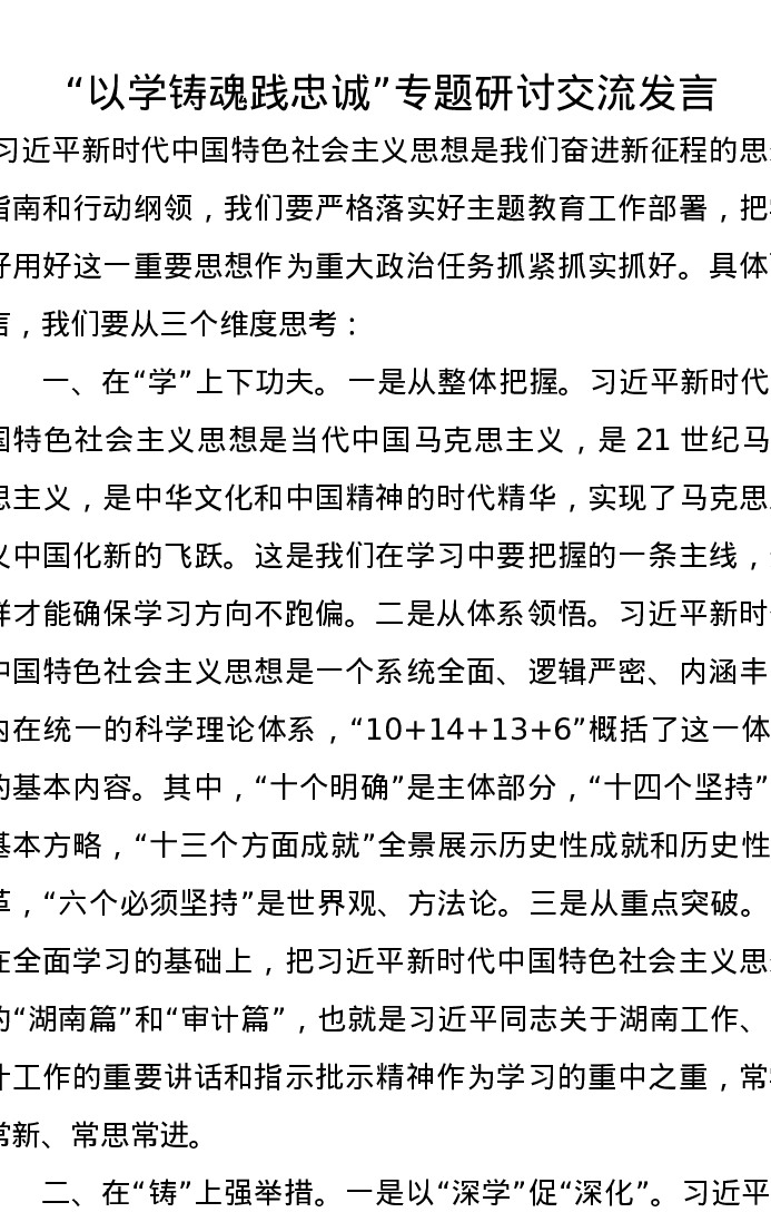 “以学铸魂践忠诚”专题研讨交流发言