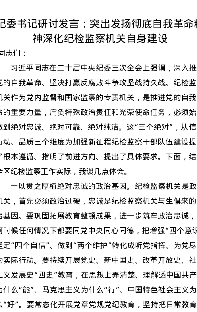 纪委书记研讨发言:突出发扬彻底自我革命精神,深化纪检监察机关自身建设