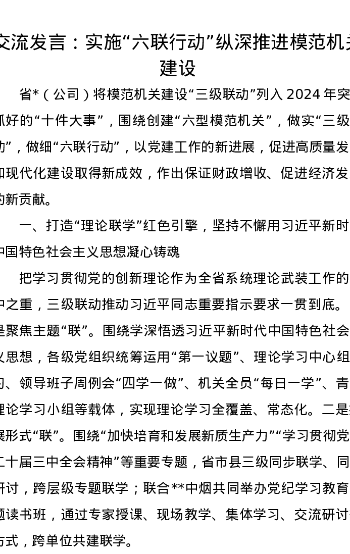 交流发言:实施“六联行动”纵深推进模范机关建设