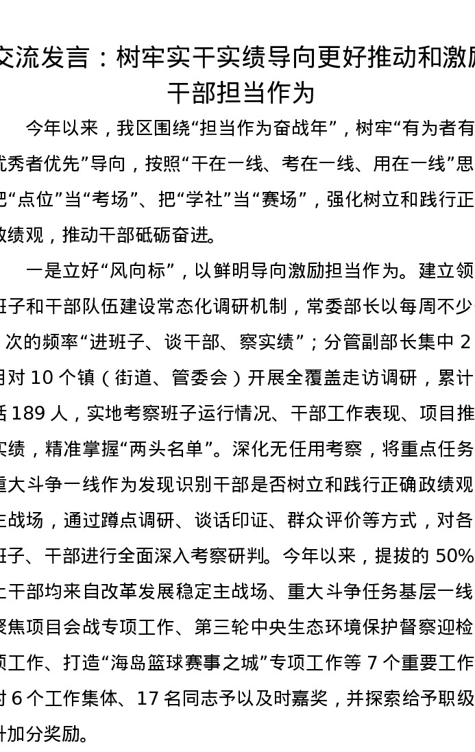 交流发言:树牢实干实绩导向更好推动和激励干部担当作为