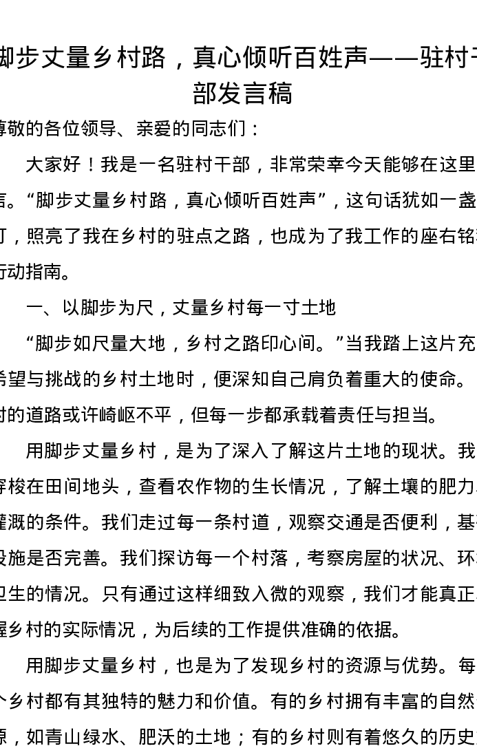 脚步丈量乡村路,真心倾听百姓声——驻村干部发言稿