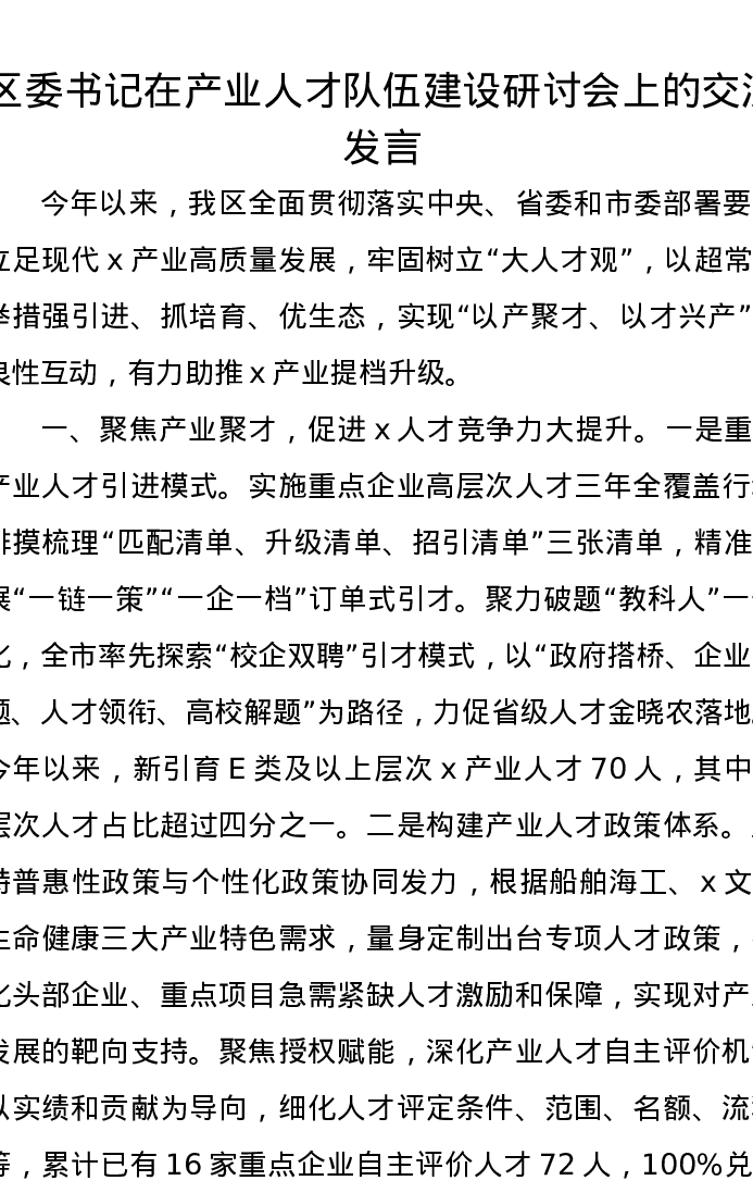区委书记在产业人才队伍建设研讨会上的交流发言