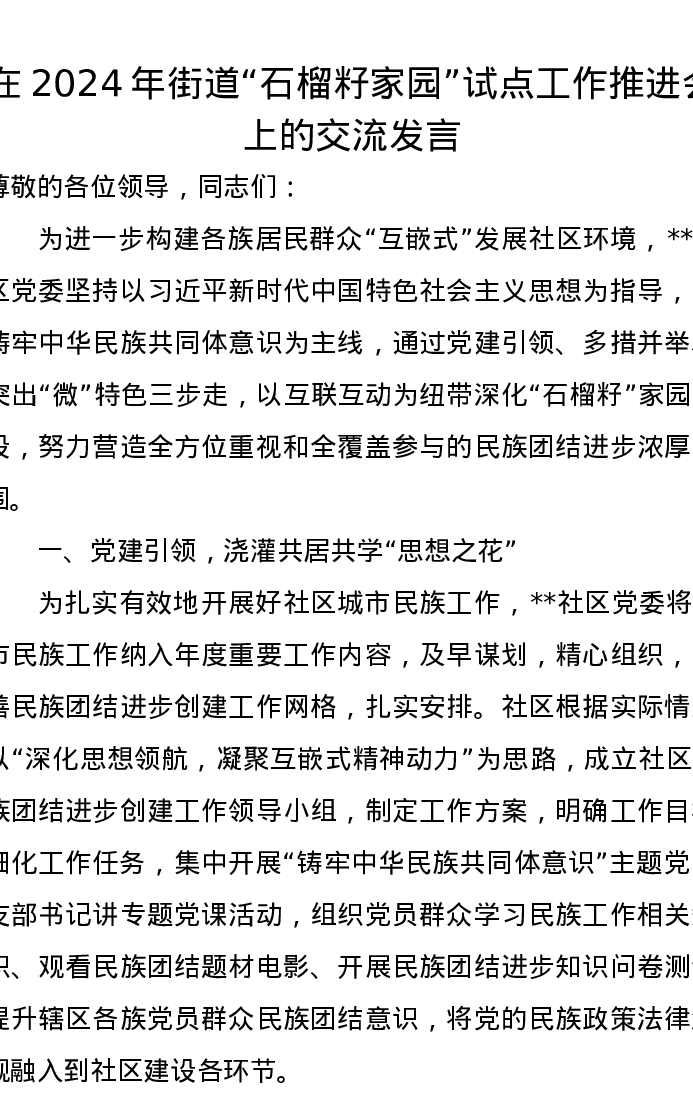 在2024年街道“石榴籽家园”试点工作推进会上的交流发言