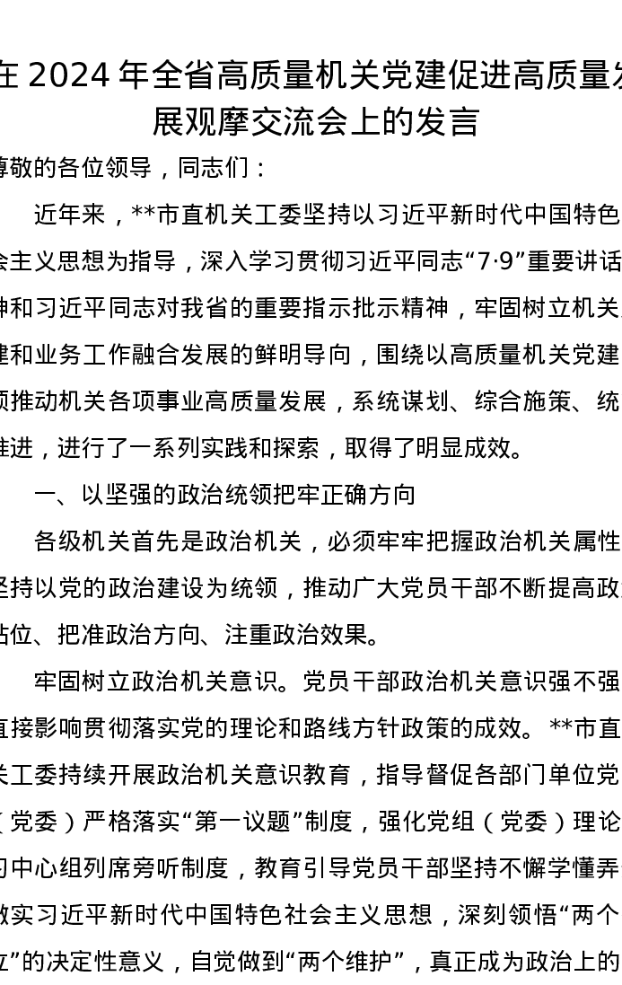 在2024年全省高质量机关党建促进高质量发展观摩交流会上的发言