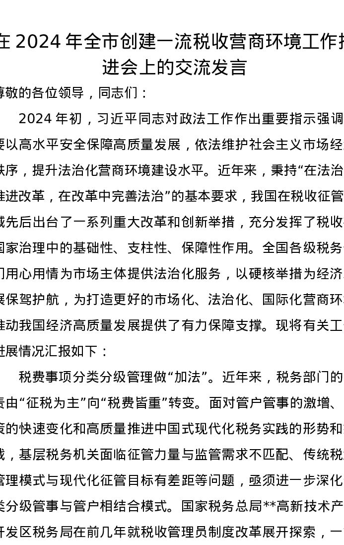 在2024年全市创建一流税收营商环境工作推进会上的交流发言