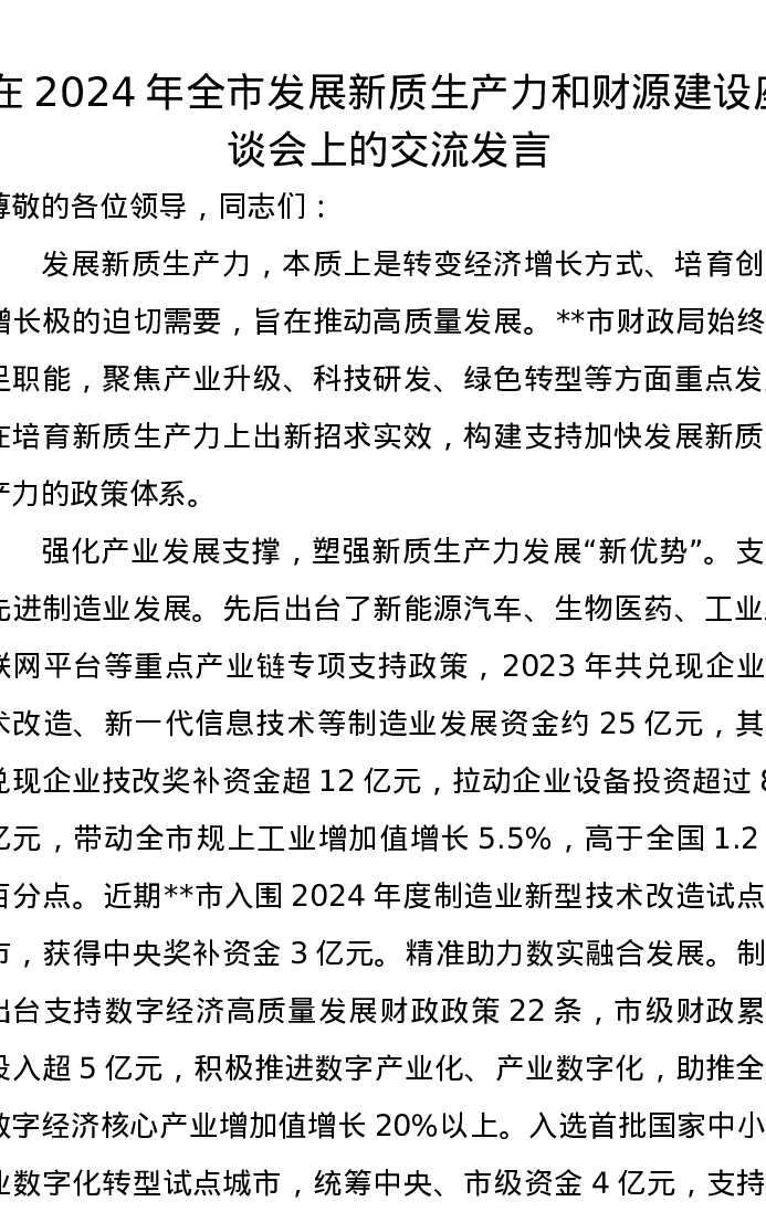 在2024年全市发展新质生产力和财源建设座谈会上的交流发言