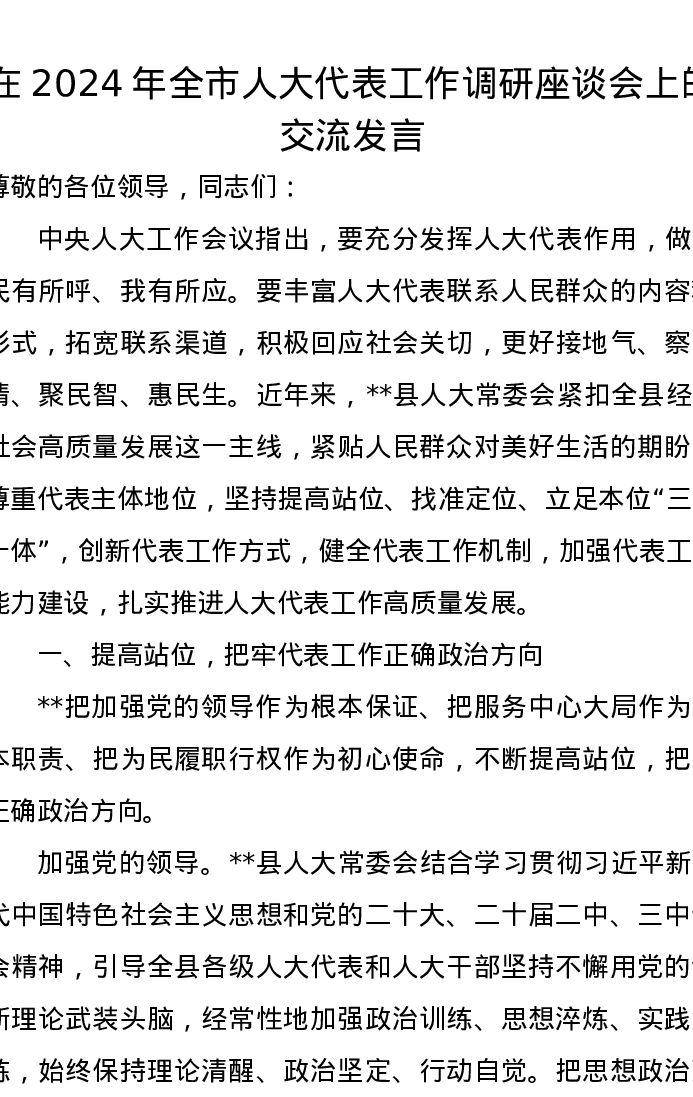 在2024年全市人大代表工作调研座谈会上的交流发言