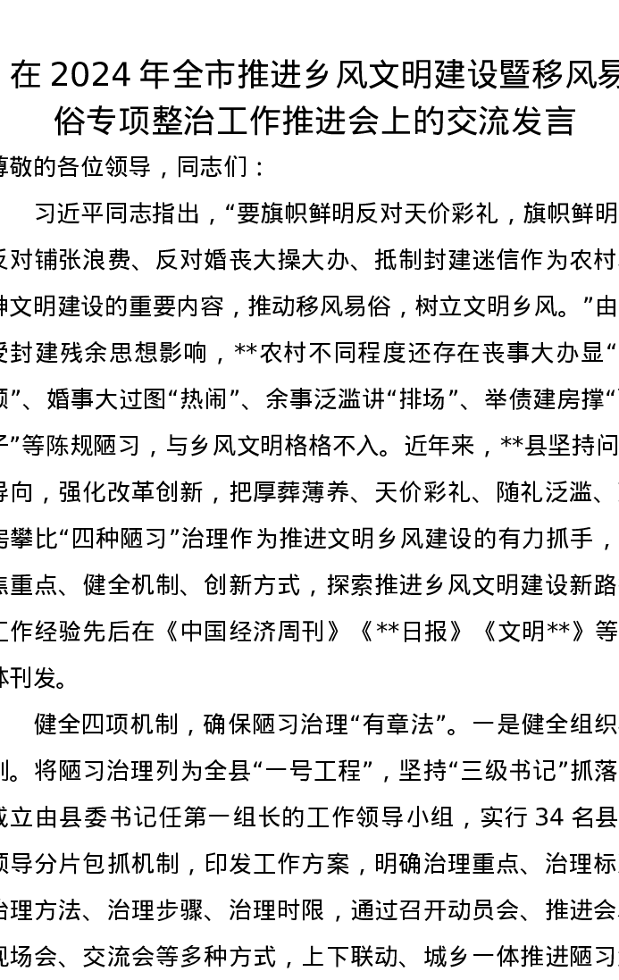 在2024年全市推进乡风文明建设暨移风易俗专项整治工作推进会上的交流发言