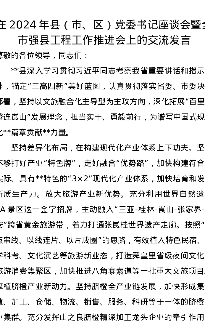 在2024年县(市、区)党委书记座谈会暨全市强县工程工作推进会上的交流发言