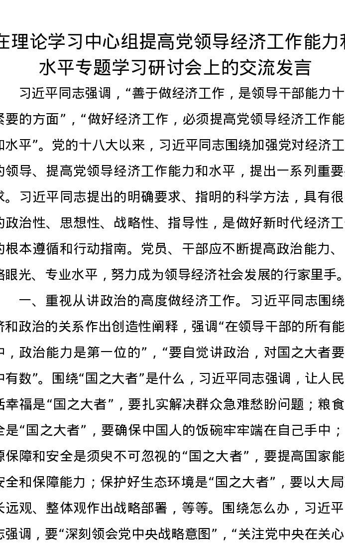 在理论学习中心组提高党领导经济工作能力和水平专题学习研讨会上的交流发言