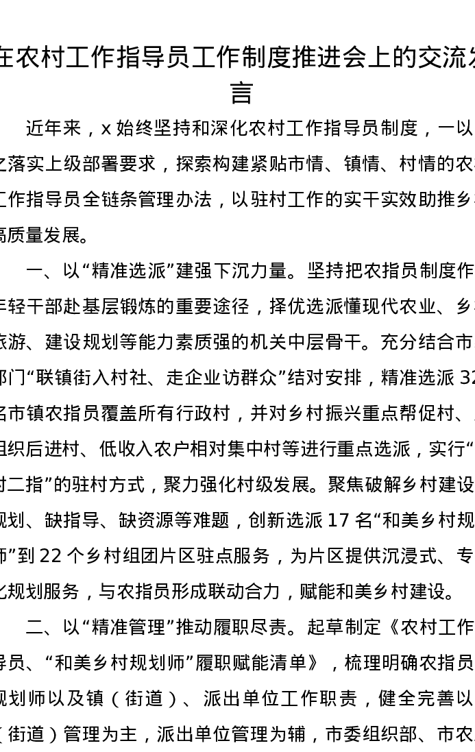 在农村工作指导员工作制度推进会上的交流发言