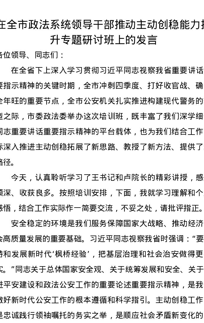 在全市政法系统领导干部推动主动创稳能力提升专题研讨班上的发言