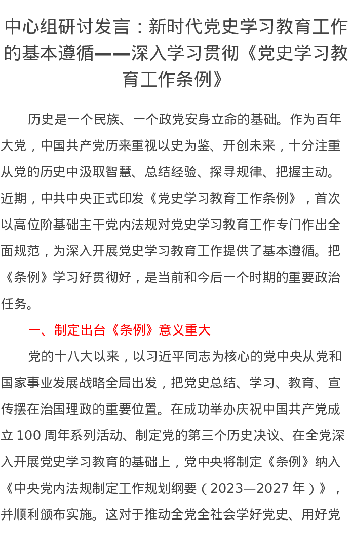 中心组研讨发言:新时代党史学习教育工作的基本遵循——深入学习贯彻《党史学习教育工作条例》