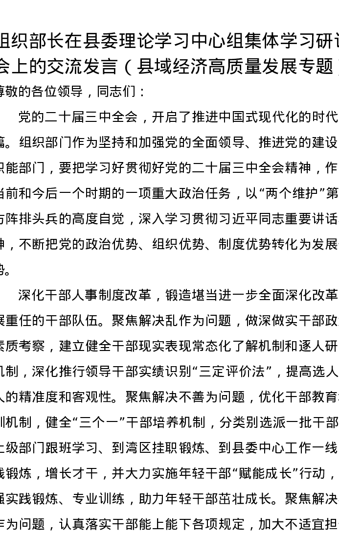 组织部长在县委理论学习中心组集体学习研讨会上的交流发言(县域经济高质量发展专题)