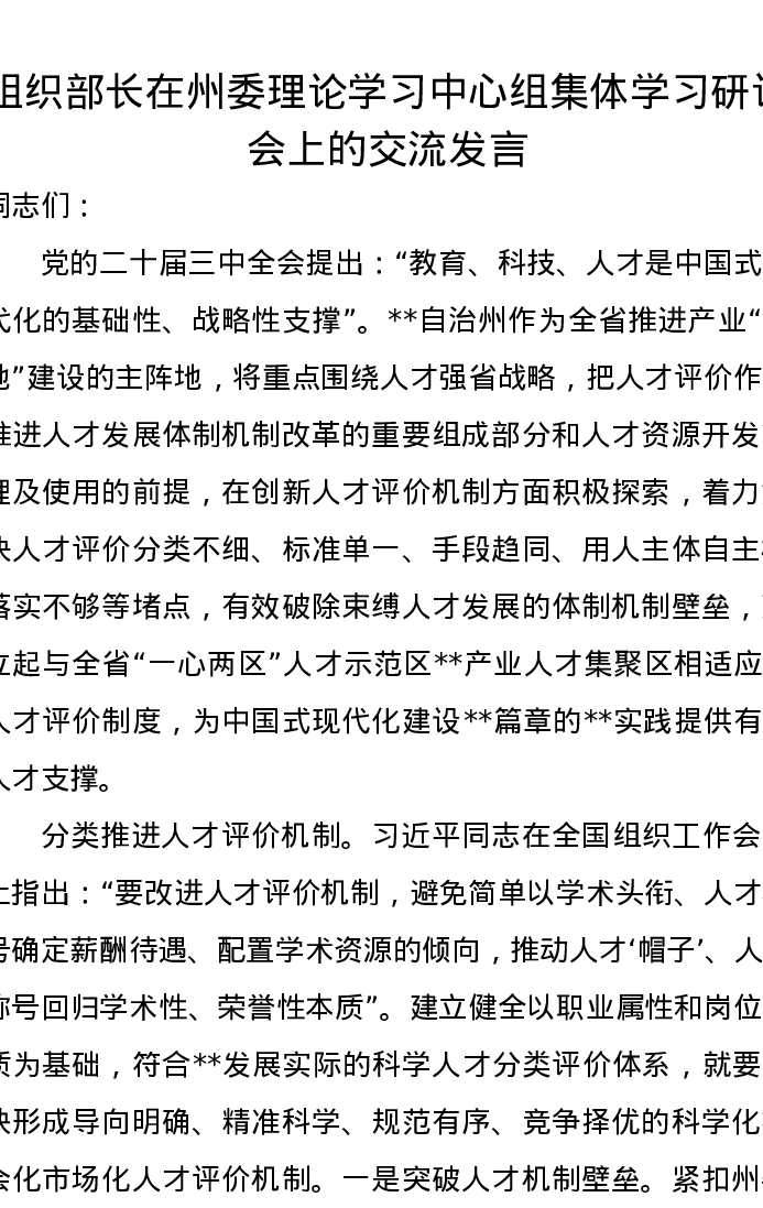 组织部长在州委理论学习中心组集体学习研讨会上的交流发言