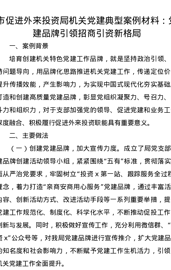 市促进外来投资局机关党建典型案例材料:党建品牌引领招商引资新格局
