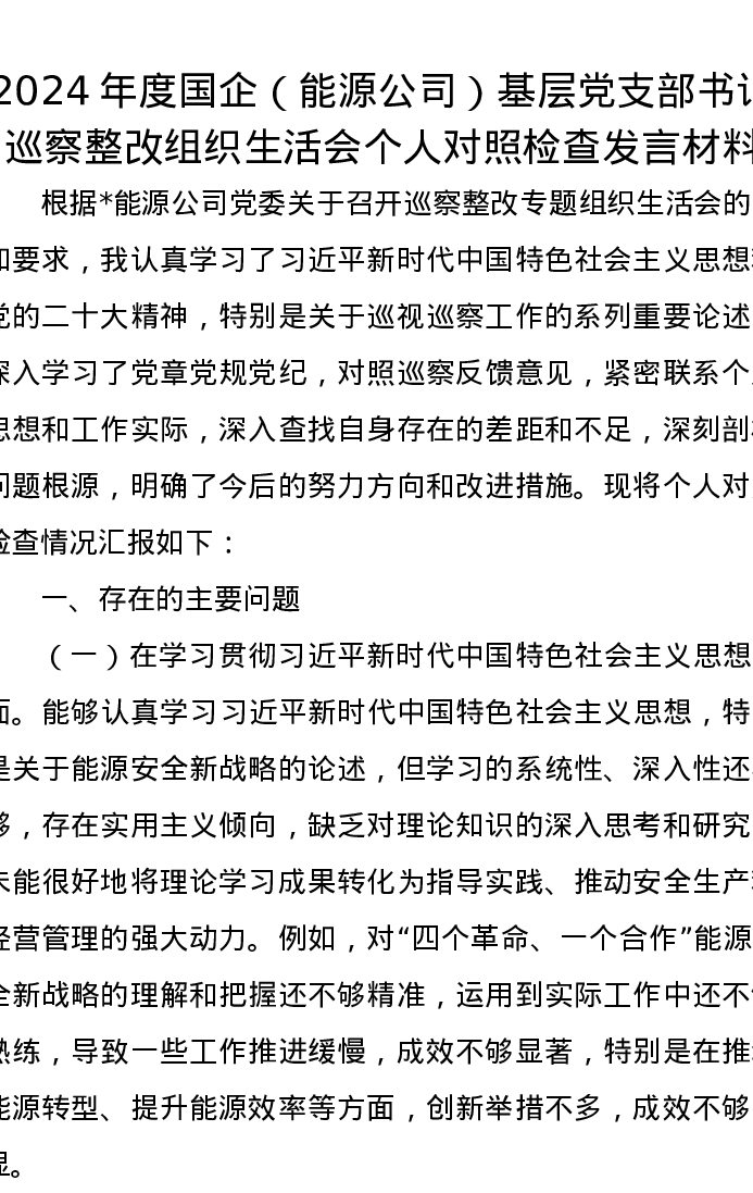 2024年度国企(能源公司)基层党支部书记巡察整改组织生活会个人对照检查发言材料
