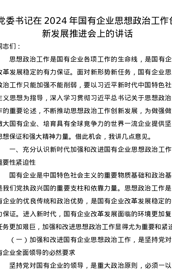 党委书记在2024年国有企业思想政治工作创新发展推进会上的讲话