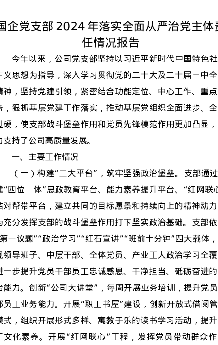 国企党支部2024年落实全面从严治党主体责任情况报告