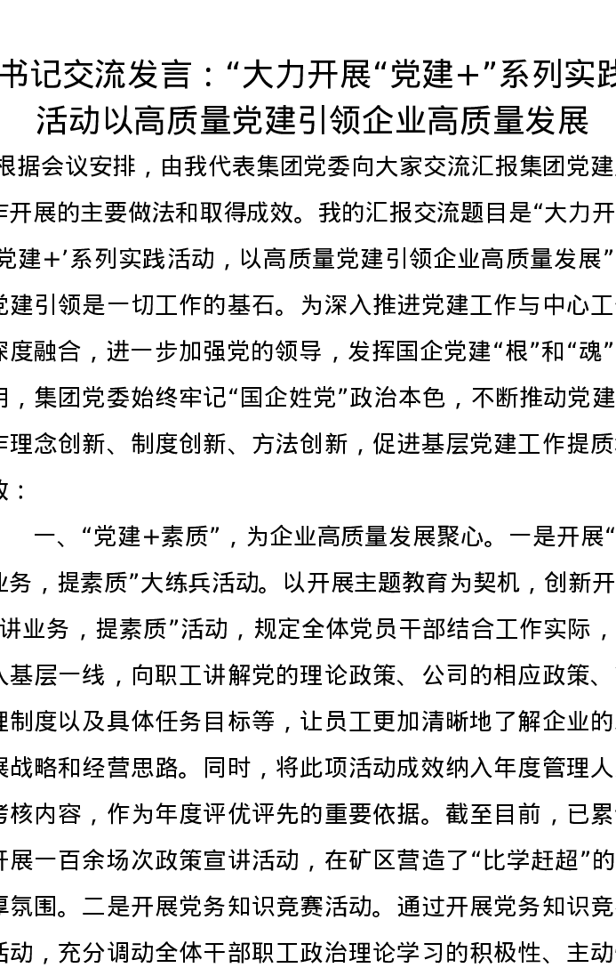 书记交流发言:“大力开展“党建+”系列实践活动 以高质量党建引领企业高质量发展