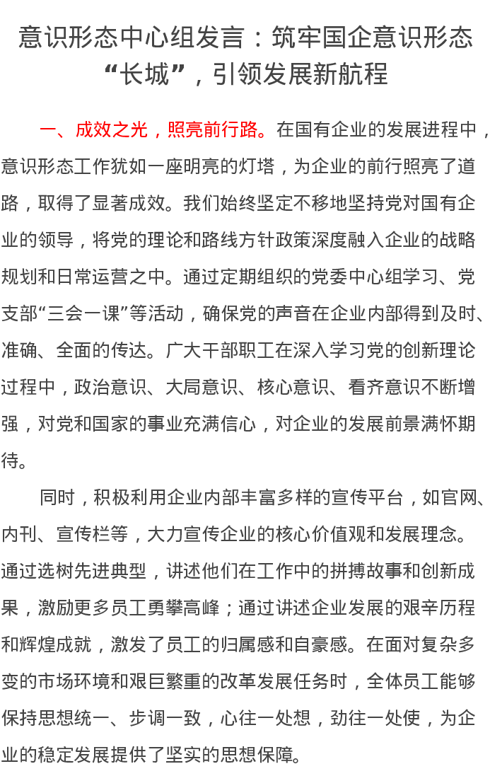 意识形态中心组发言:筑牢国企意识形态“长城”,引领发展新航程