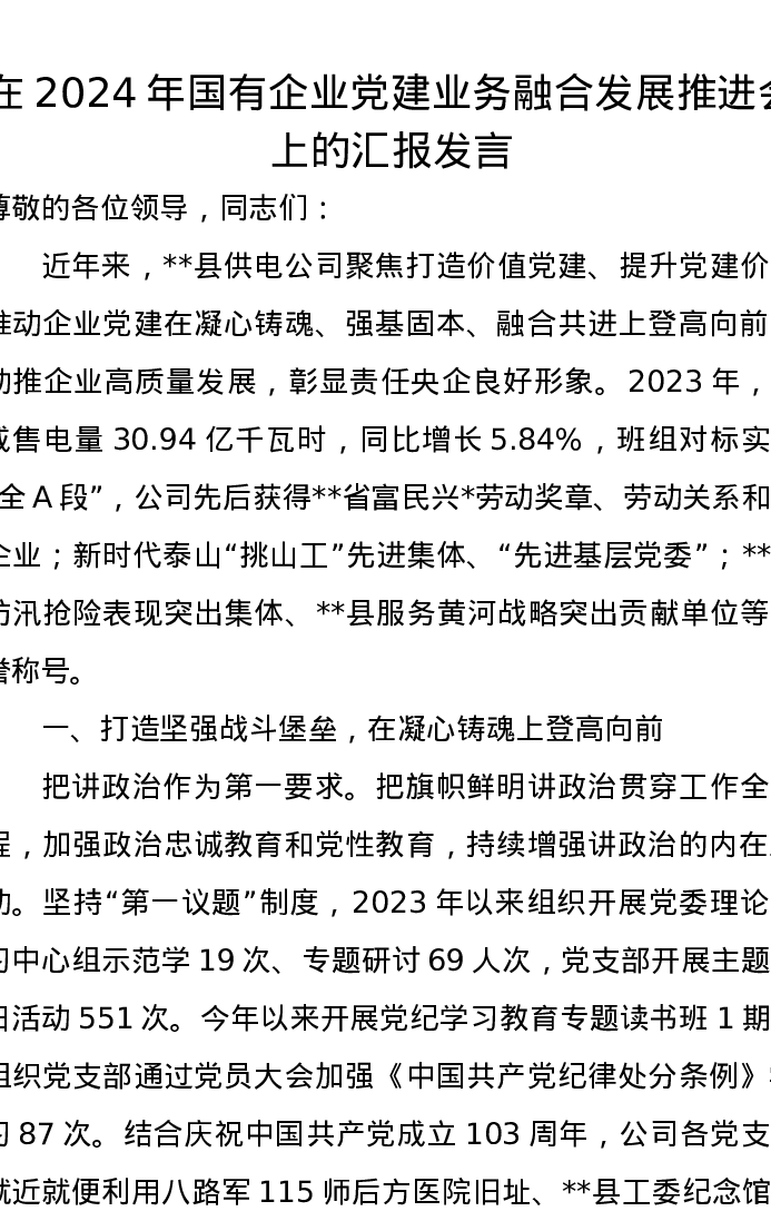 在2024年国有企业党建业务融合发展推进会上的汇报发言
