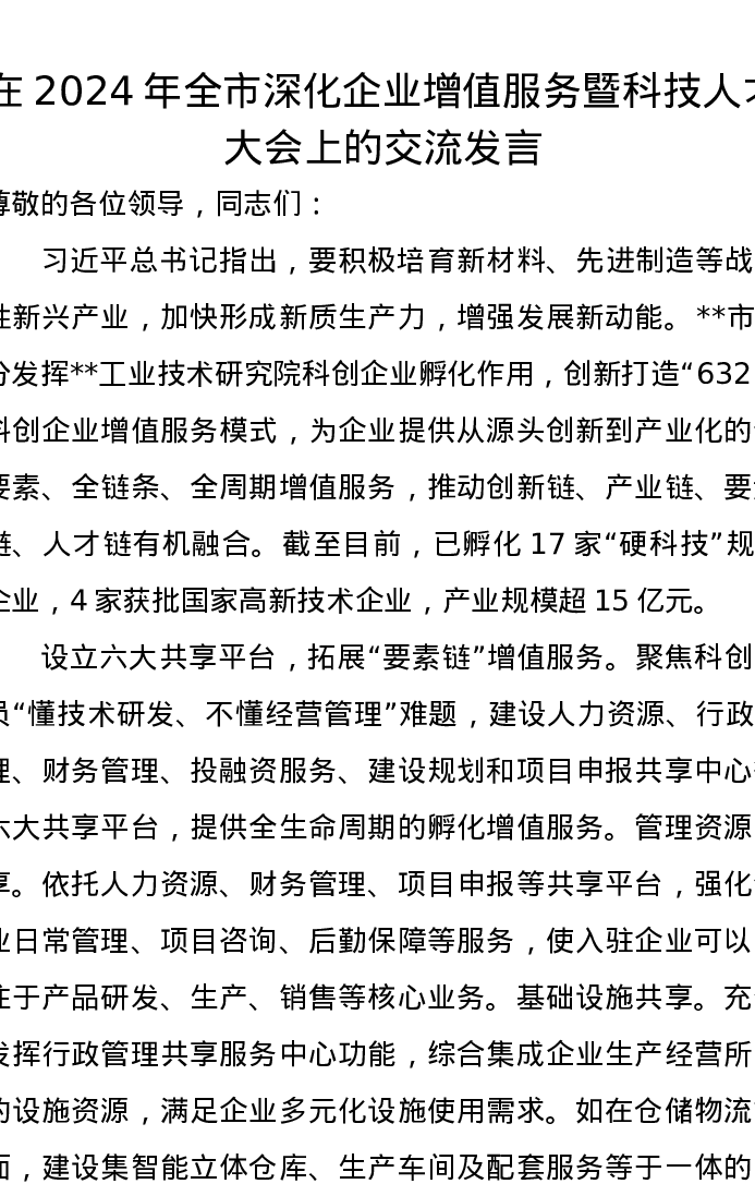 在2024年全市深化企业增值服务暨科技人才大会上的交流发言