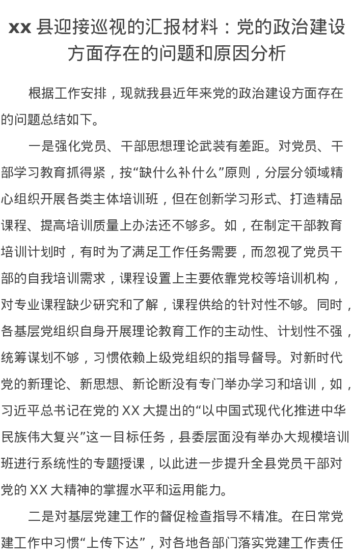 xx县迎接巡视的汇报材料:党的政治建设方面存在的问题和原因分析