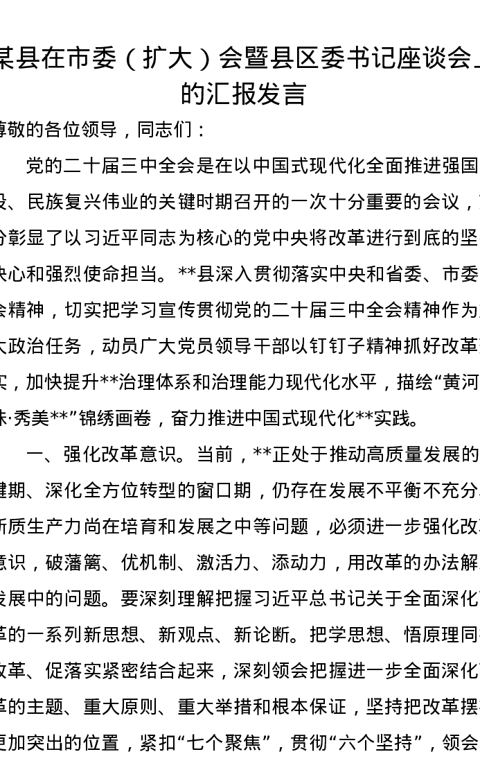 某县在市委(扩大)会暨县区委书记座谈会上的汇报发言