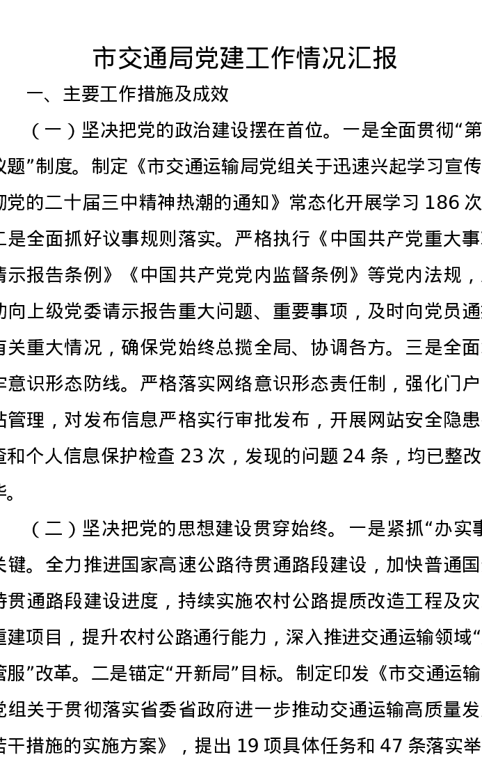 市交通局党建工作情况汇报