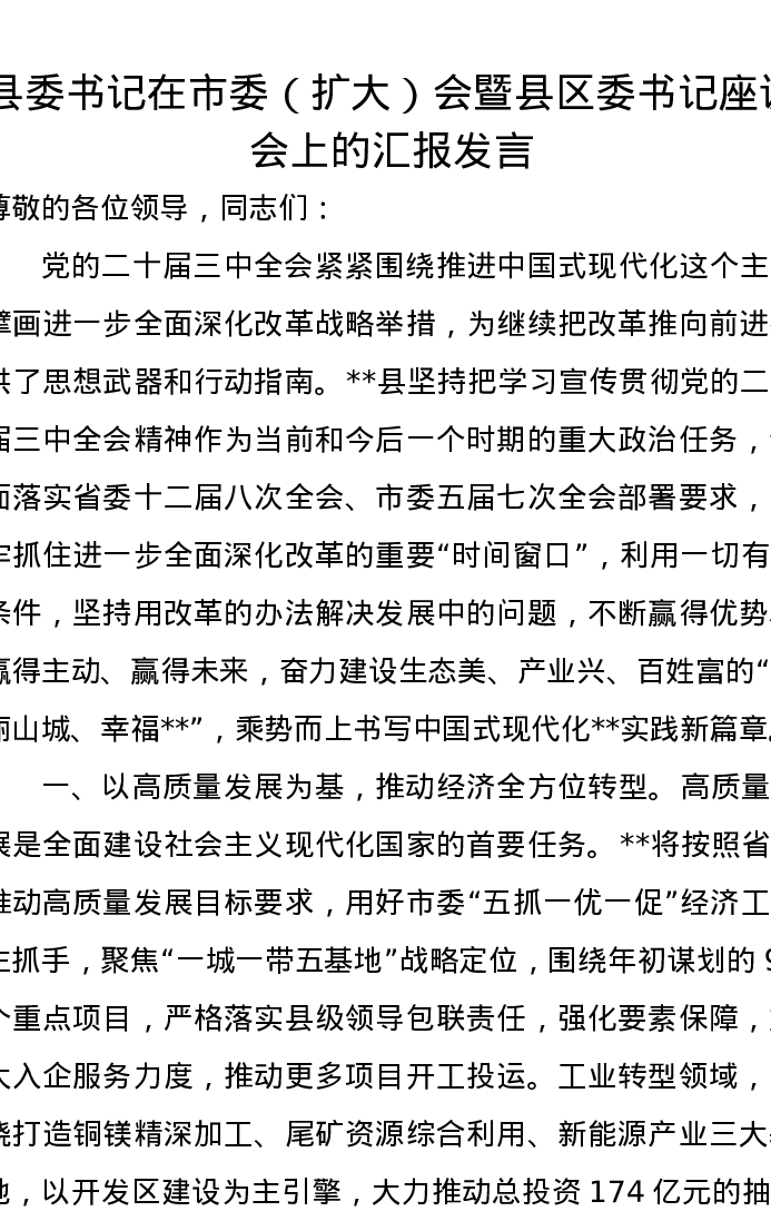 县委书记在市委(扩大)会暨县区委书记座谈会上的汇报发言
