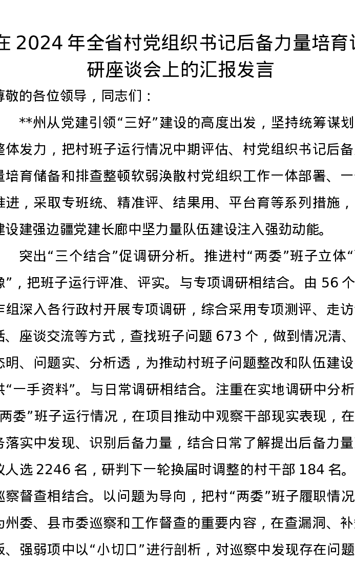 在2024年全省村党组织书记后备力量培育调研座谈会上的汇报发言