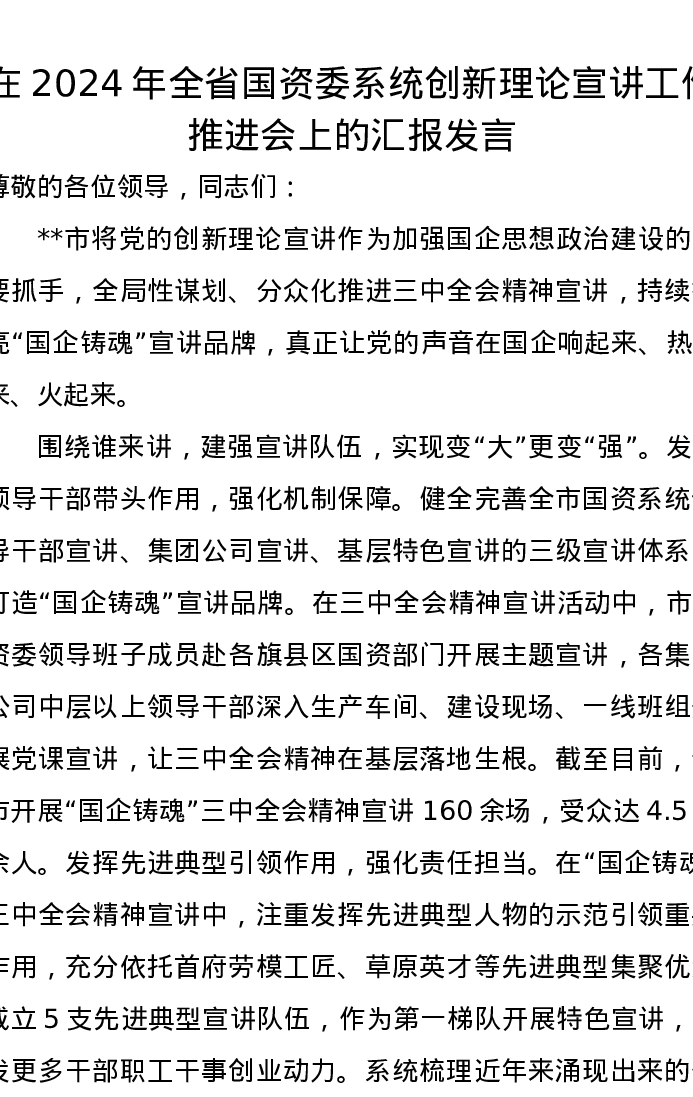 在2024年全省国资委系统创新理论宣讲工作推进会上的汇报发言