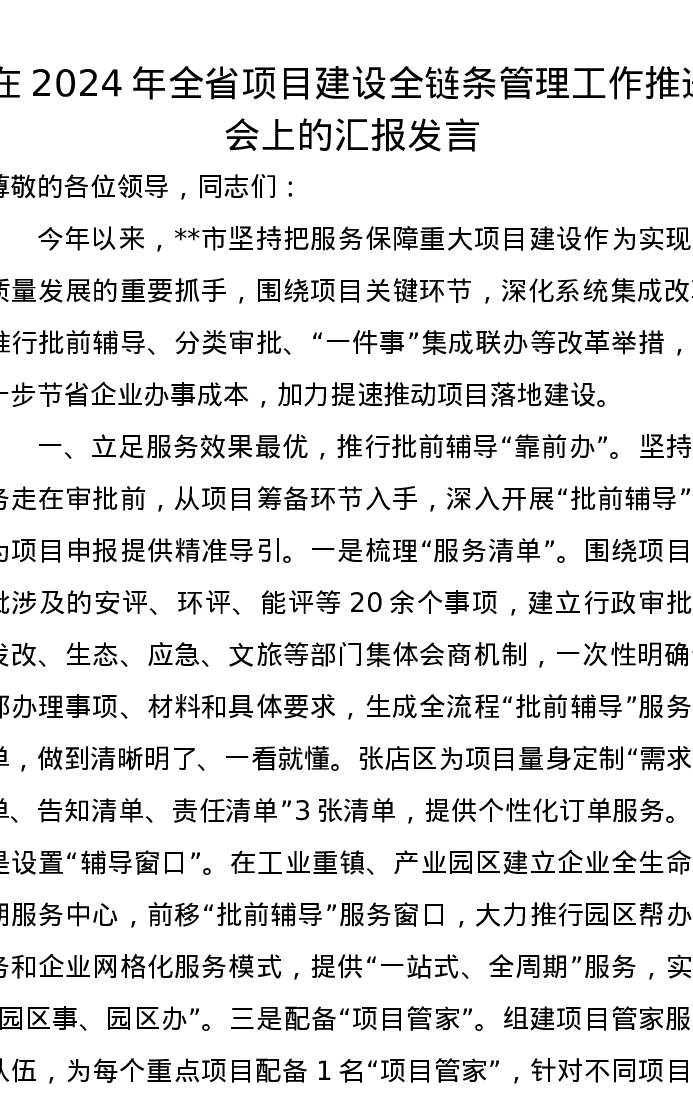 在2024年全省项目建设全链条管理工作推进会上的汇报发言