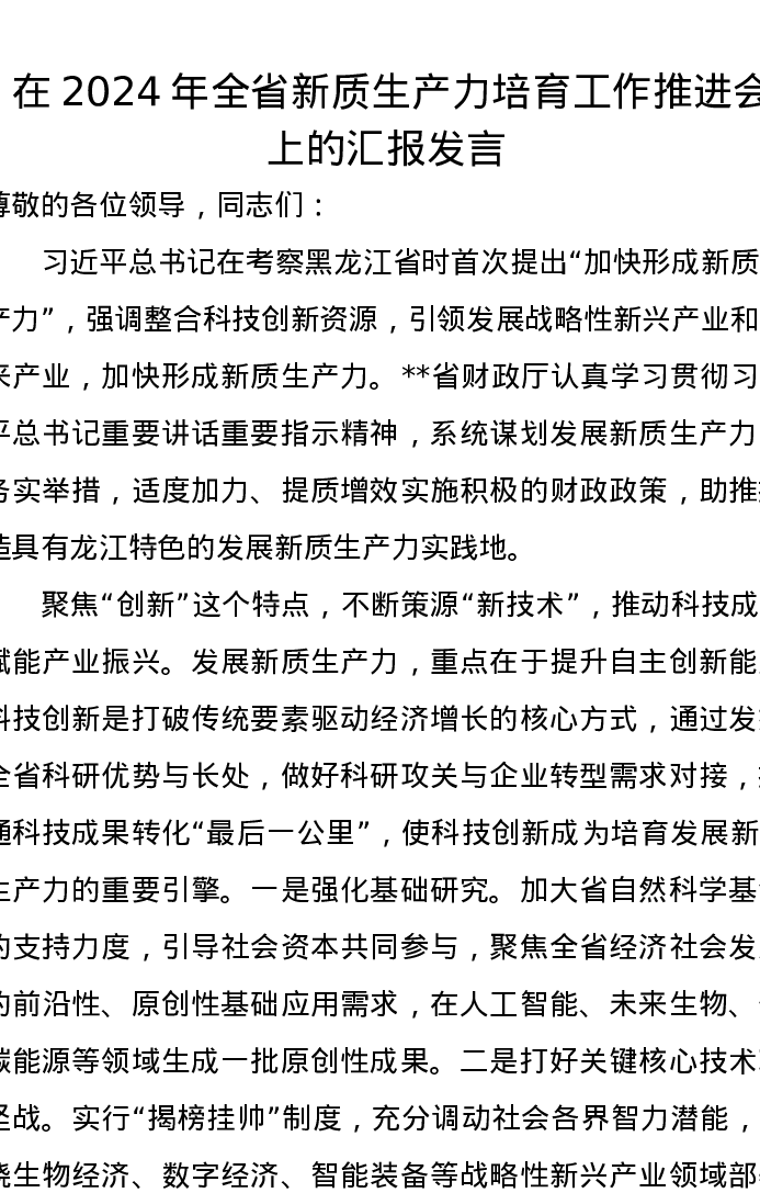在2024年全省新质生产力培育工作推进会上的汇报发言
