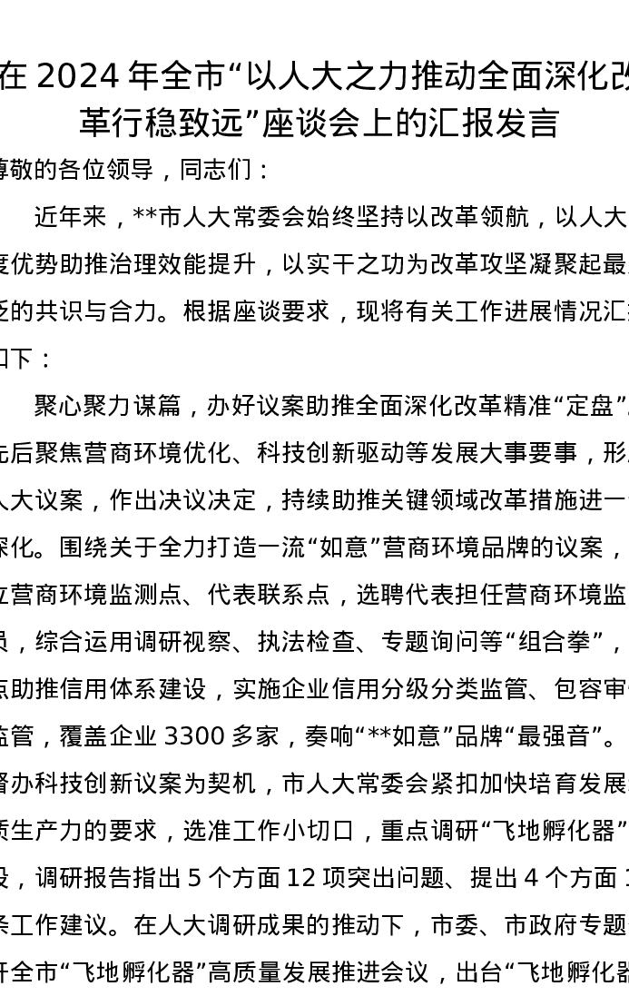 在2024年全市“以人大之力推动全面深化改革行稳致远”座谈会上的汇报发言