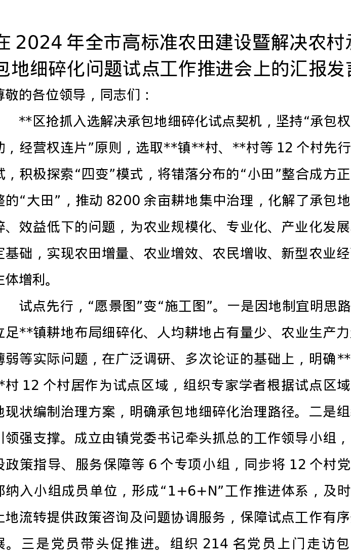 在2024年全市高标准农田建设暨解决农村承包地细碎化问题试点工作推进会上的汇报发言