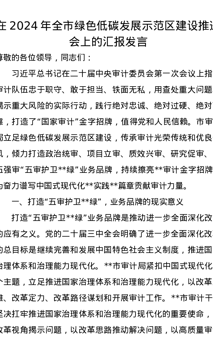 在2024年全市绿色低碳发展示范区建设推进会上的汇报发言