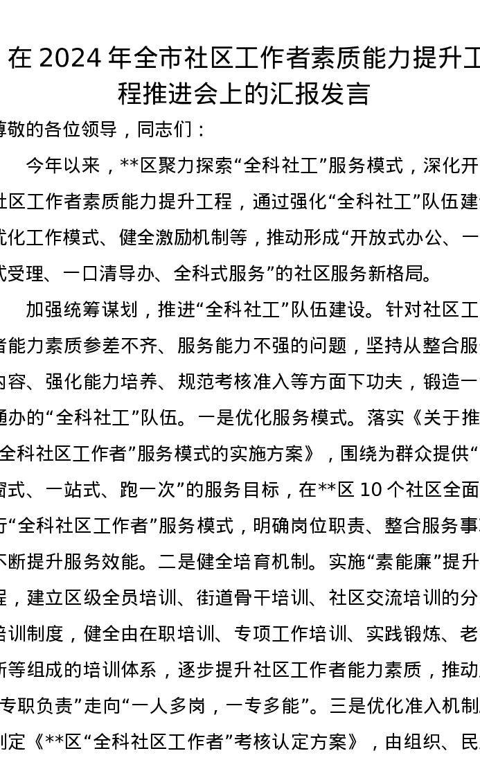 在2024年全市社区工作者素质能力提升工程推进会上的汇报发言