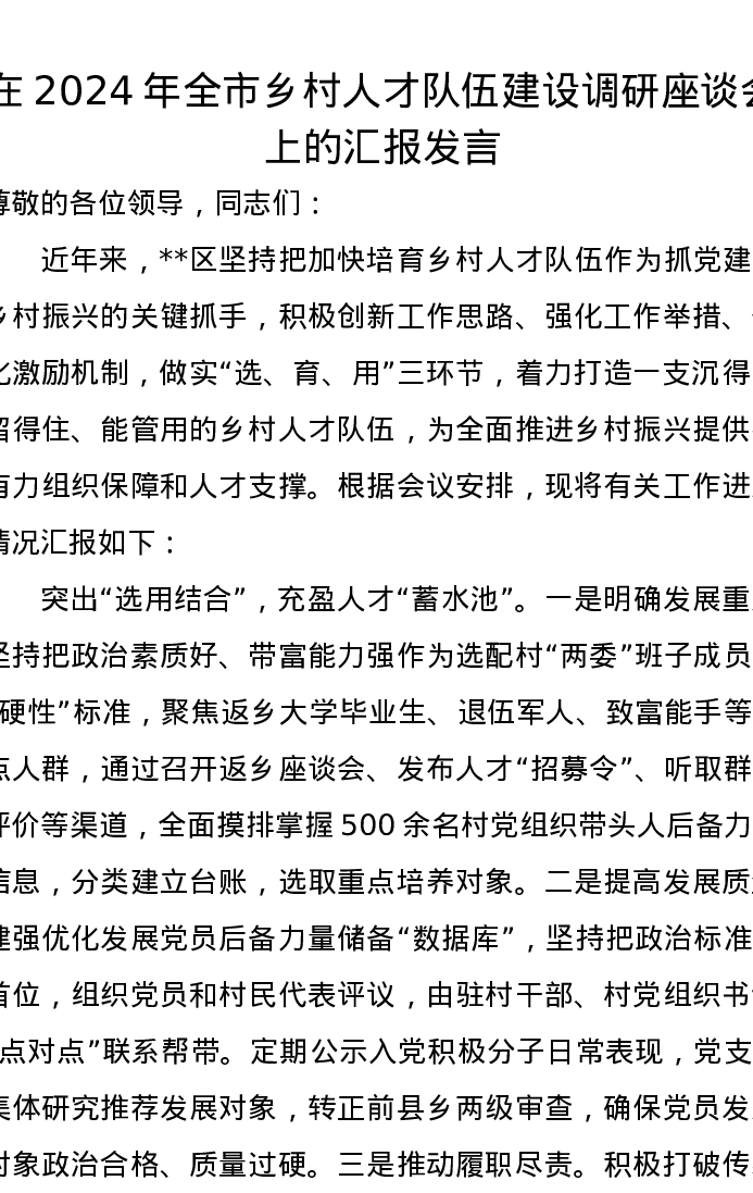 在2024年全市乡村人才队伍建设调研座谈会上的汇报发言