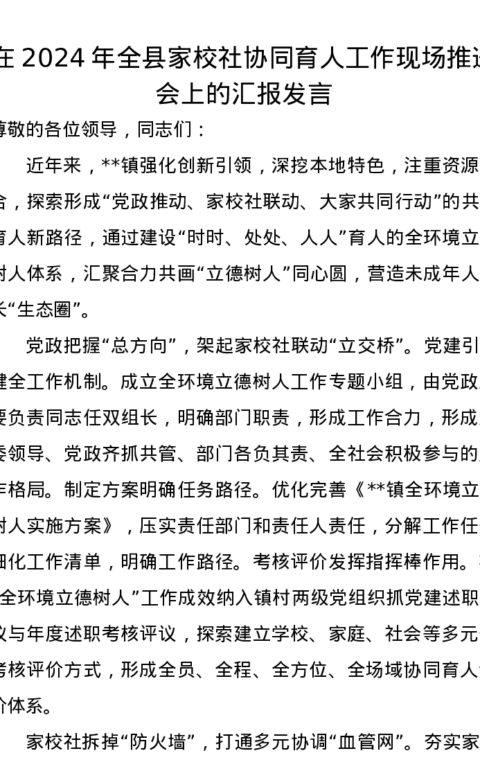 在2024年全县家校社协同育人工作现场推进会上的汇报发言