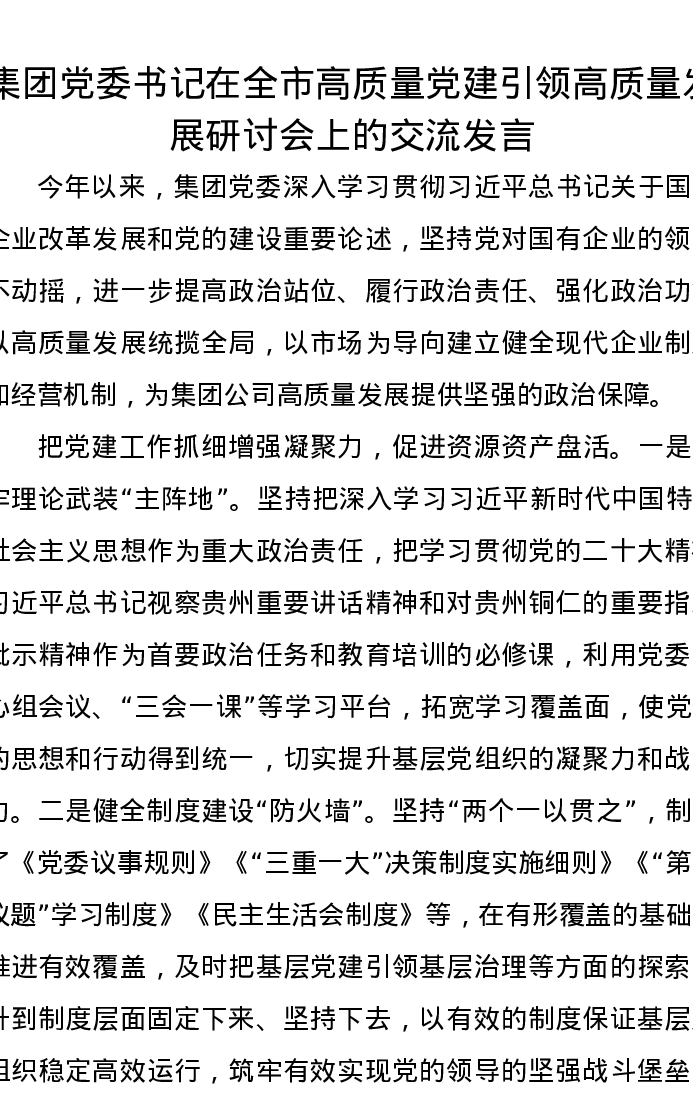 集团党委书记在全市高质量党建引领高质量发展研讨会上的交流发言
