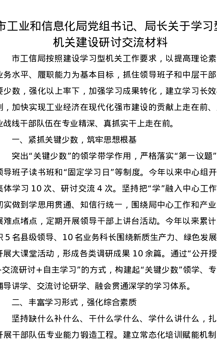 市工业和信息化局党组书记、局长关于学习型机关建设研讨交流发言材料