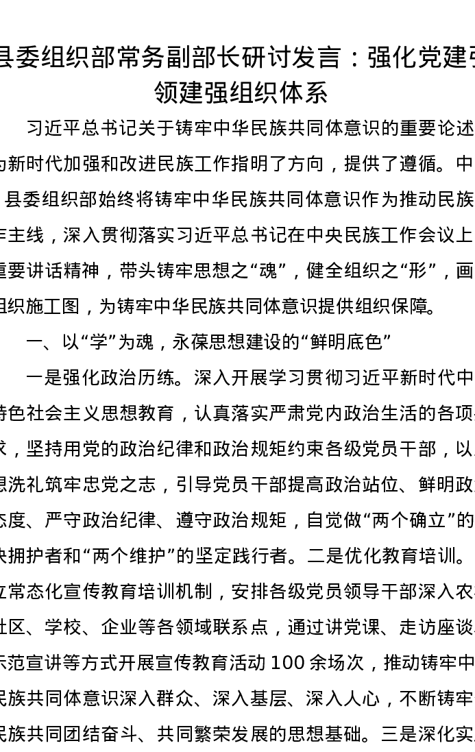 县委组织部常务副部长研讨发言:强化党建引领 建强组织体系