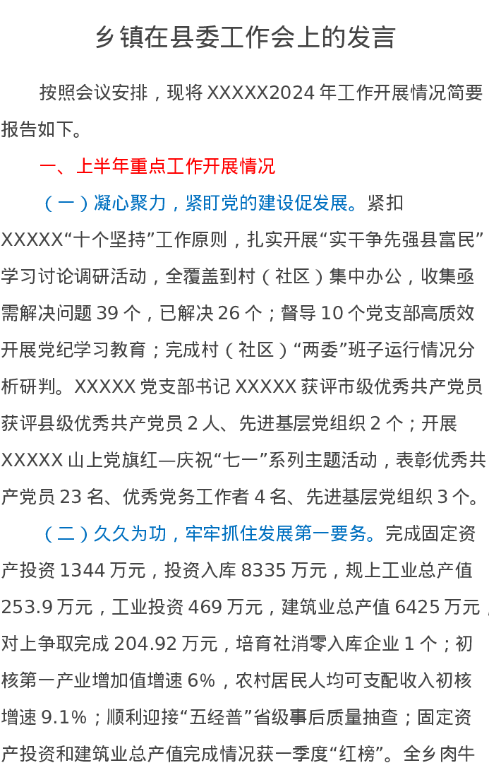 乡镇在县委工作会上的发言