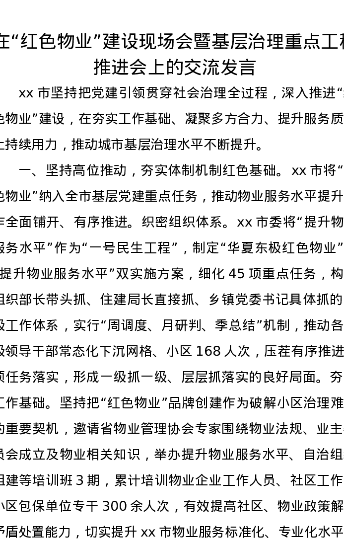 在“红色物业”建设现场会暨基层治理重点工程推进会上的交流发言