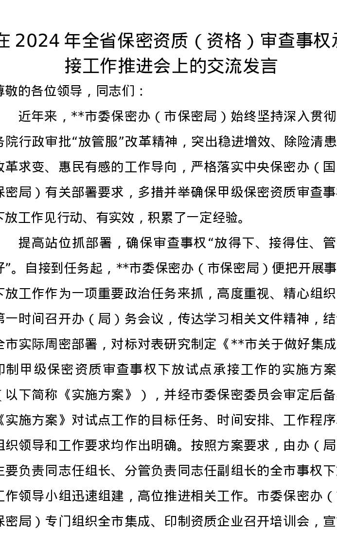 在2024年全省保密资质(资格)审查事权承接工作推进会上的交流发言