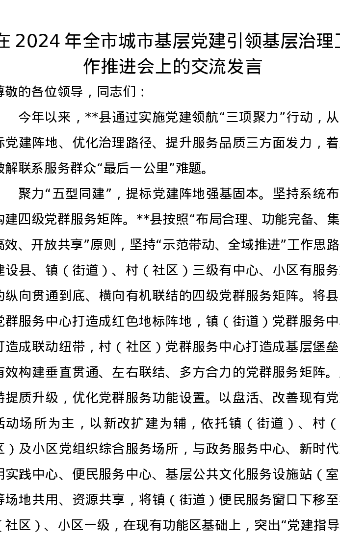 在2024年全市城市基层党建引领基层治理工作推进会上的交流发言
